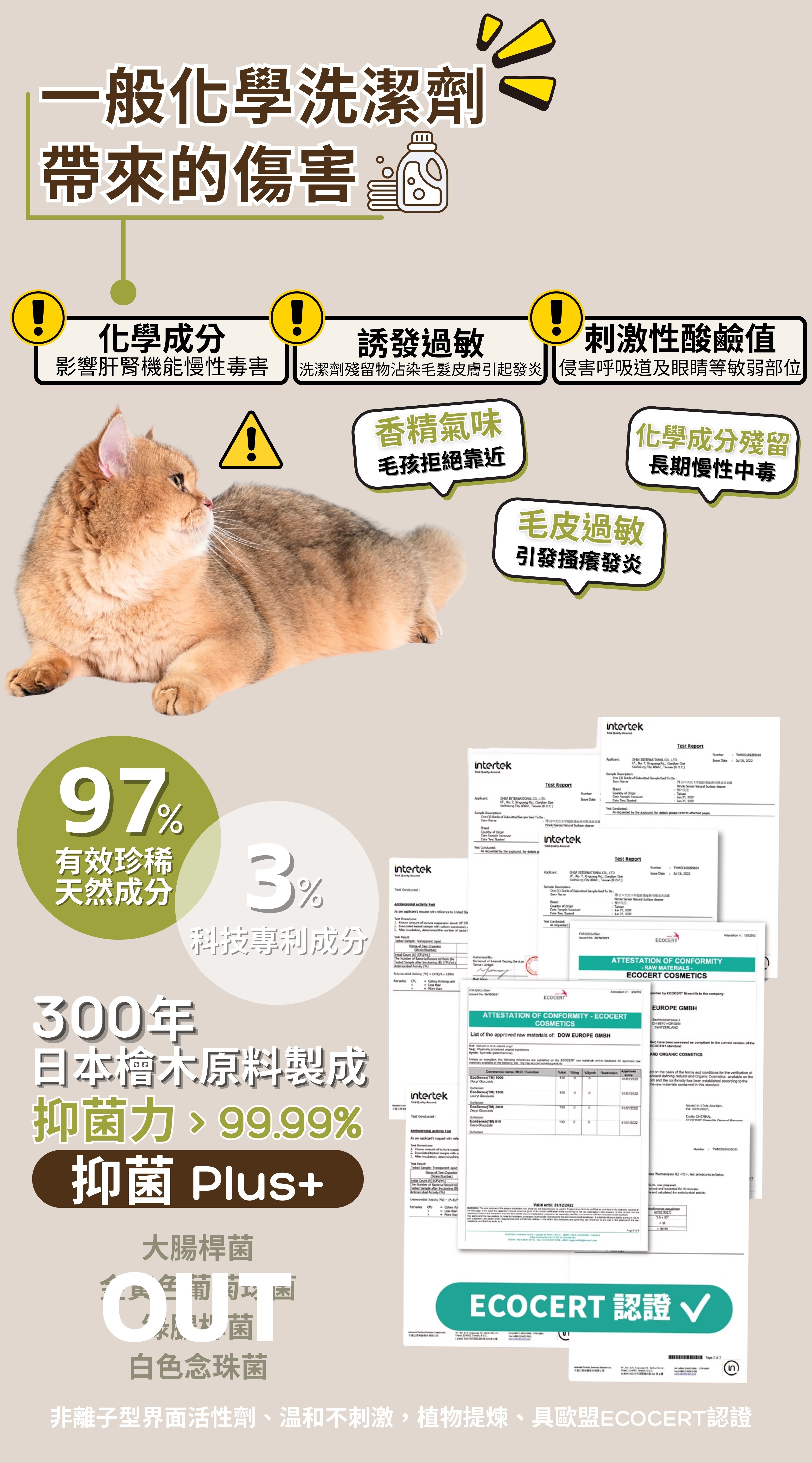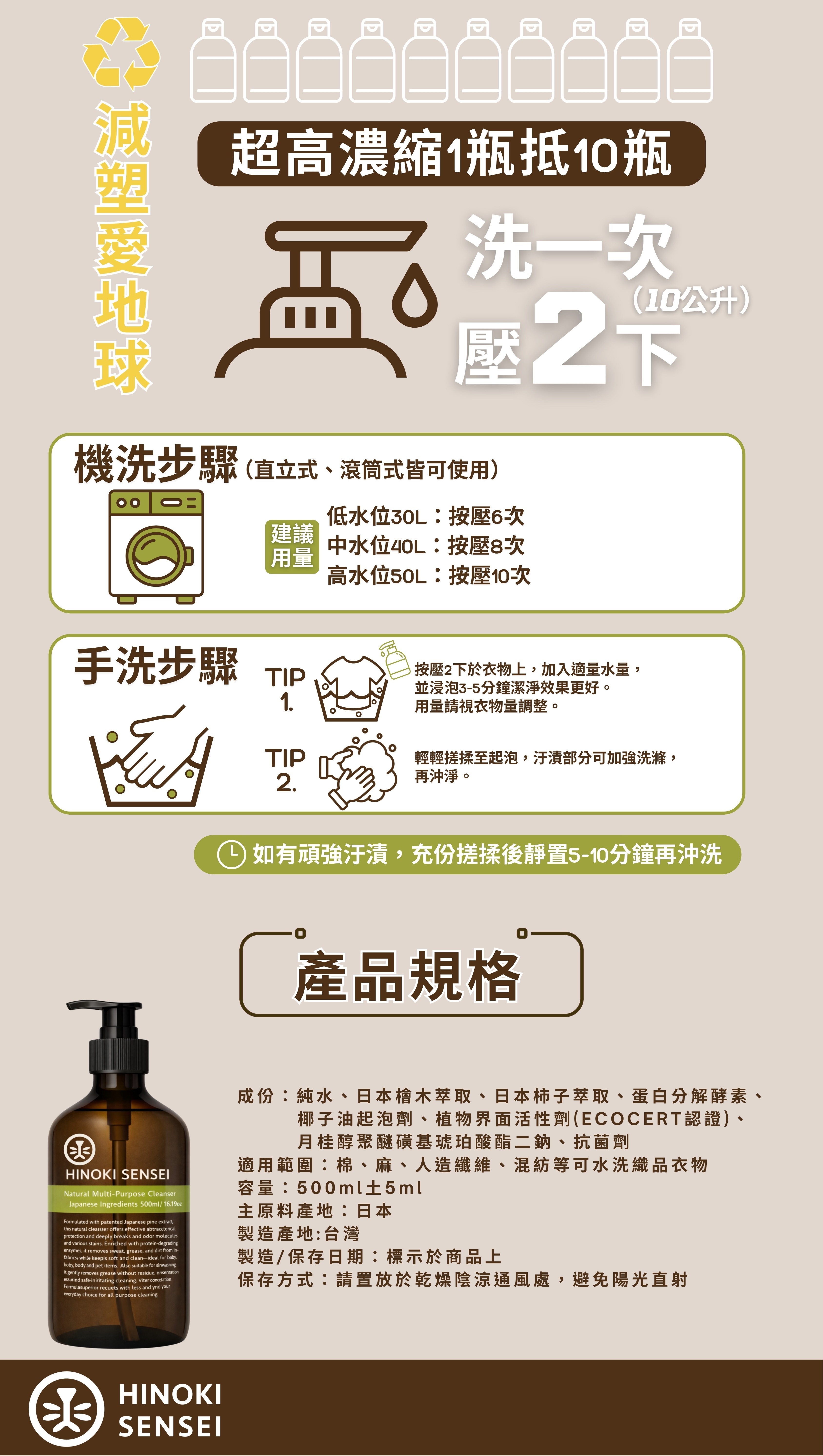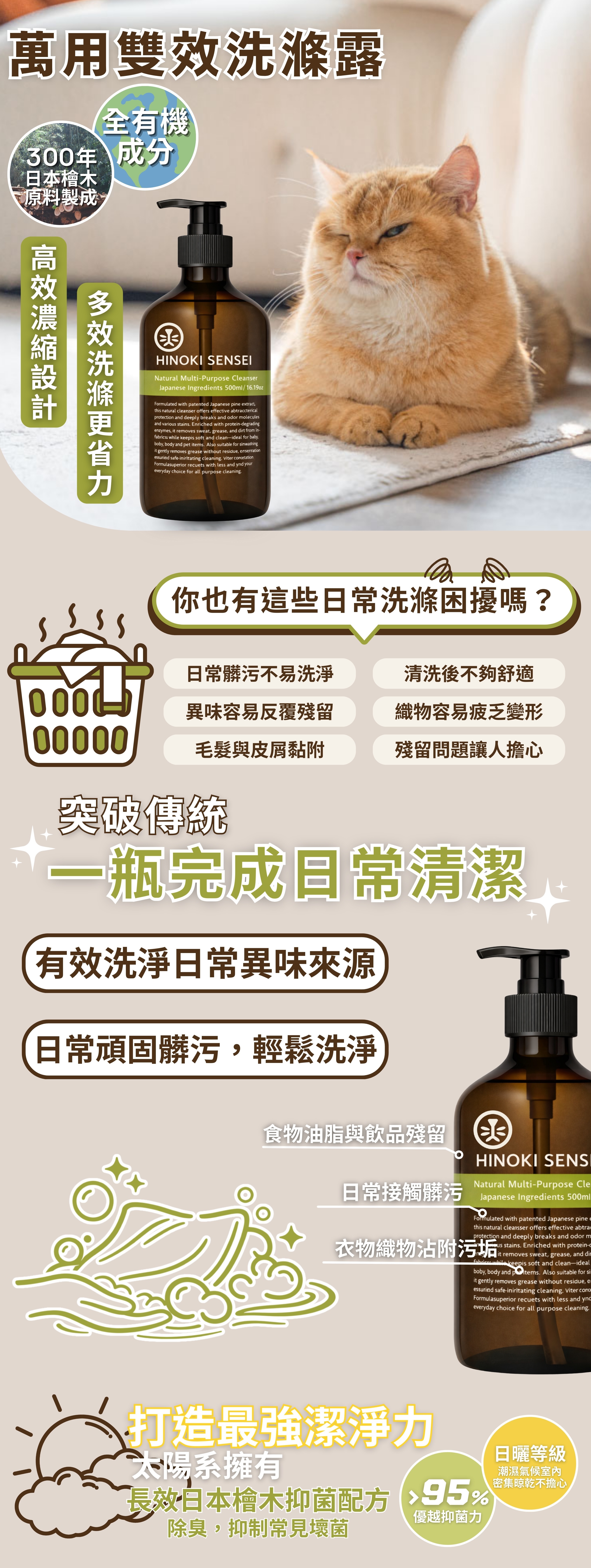 嚴選天然檜木活萃液,高濃縮配方,適用環境、衣物與碗盤清潔,潔淨無味、清新舒適。成分單純溫和,不含香精與人工氣味,手洗、機洗皆可,洗滌後雙手依然柔潤不乾澀,嬰幼兒與毛孩家庭安心使用。